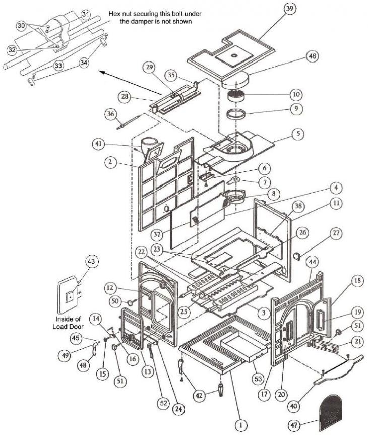 DO NOT store wood, flammable liquids or other combustible materials too close to the unit. Remove parts from inside stove. Parts include: damper (#5), damper collar (#4), blower as-sembly (#3), ash drawer (#13), pedestal front ... Return Doc